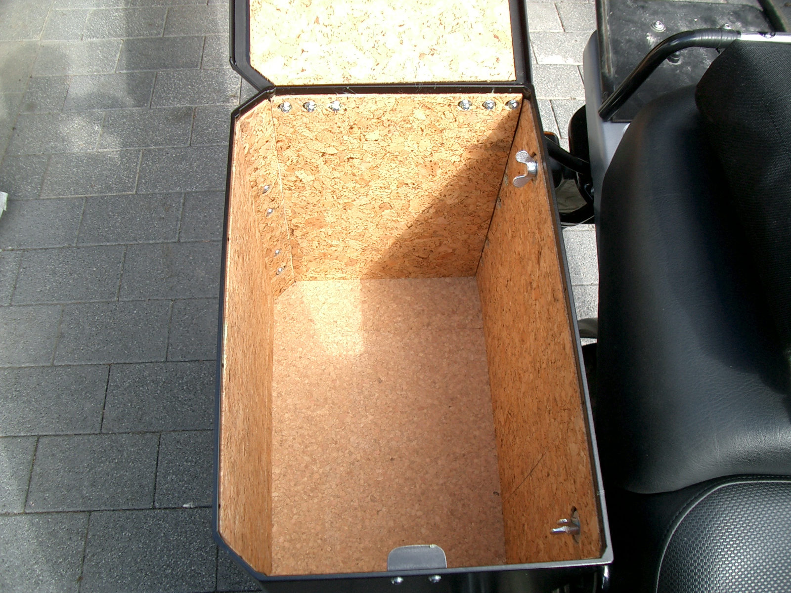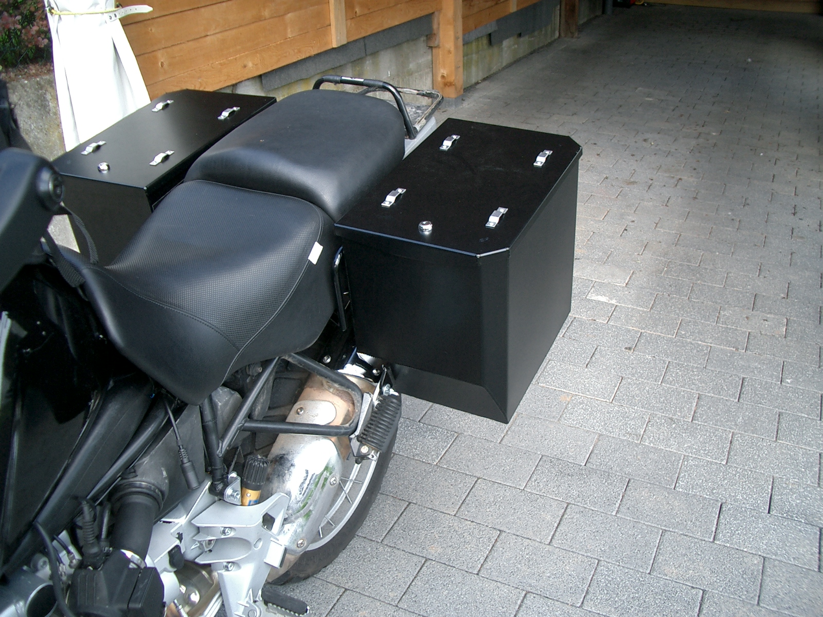 Die Originalkoffer habe ich gegen ein ALU-Koffer System von RMS (rms-rogers.de) ausgetauscht. Diese wurden pulverbeschichtet und von mir innen mit Kork ausgekleidet.